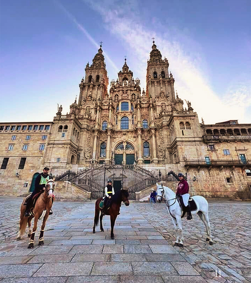 To enter Santiago on horseback is to crosscenturies in a single instant. The narrow stonestreets open in reverence, and the sound ofhooves blends with the ancient murmur ofpilgrims who have passed before. As theCathedral rises, majestic and golden in thelight, the heart quickens and time seems tostand still.It is the end of one journey and the beginningof another: the eternal memory of arriving, onhorseback, at the place where faith, tradition,and eternity meet.